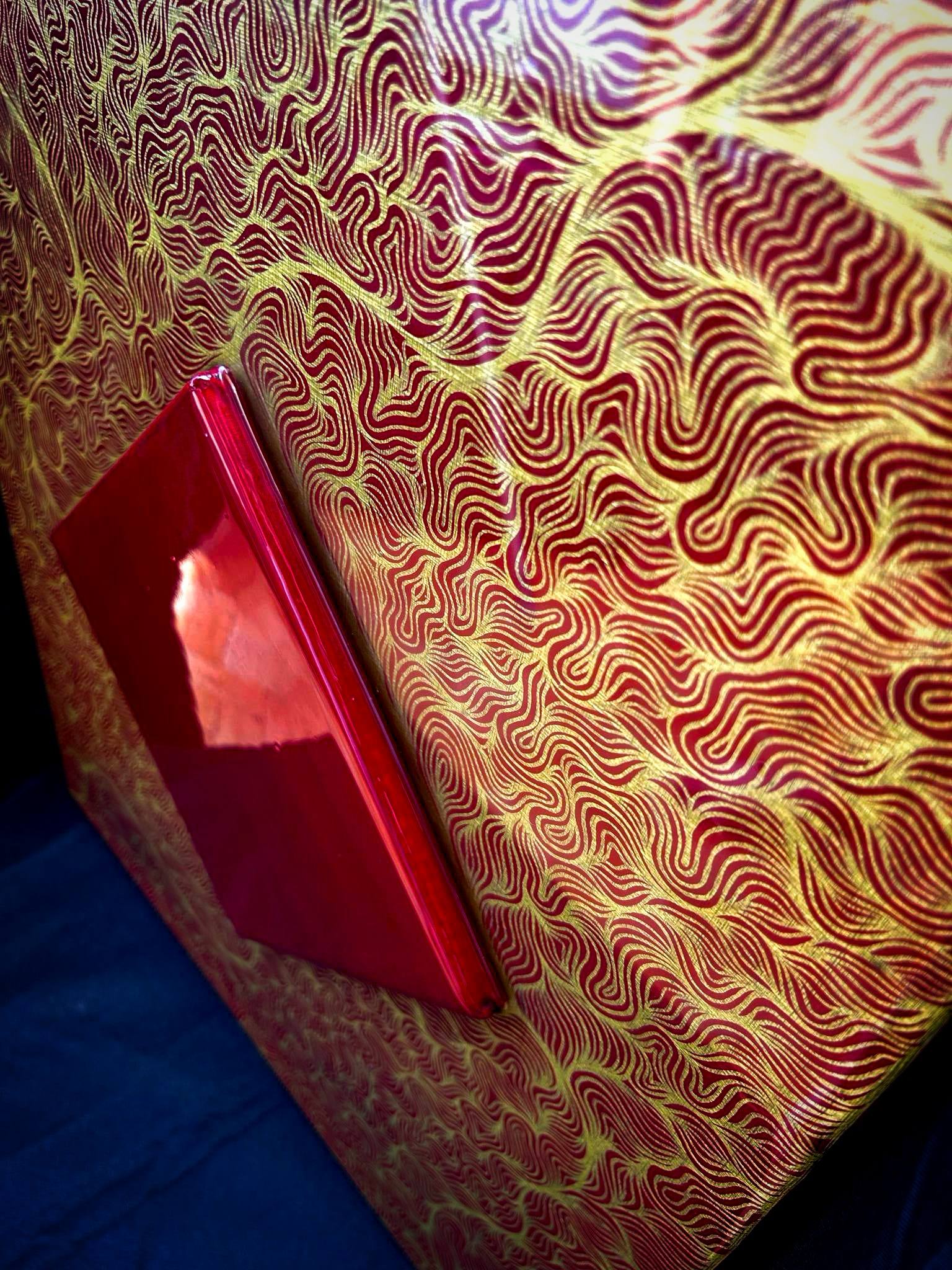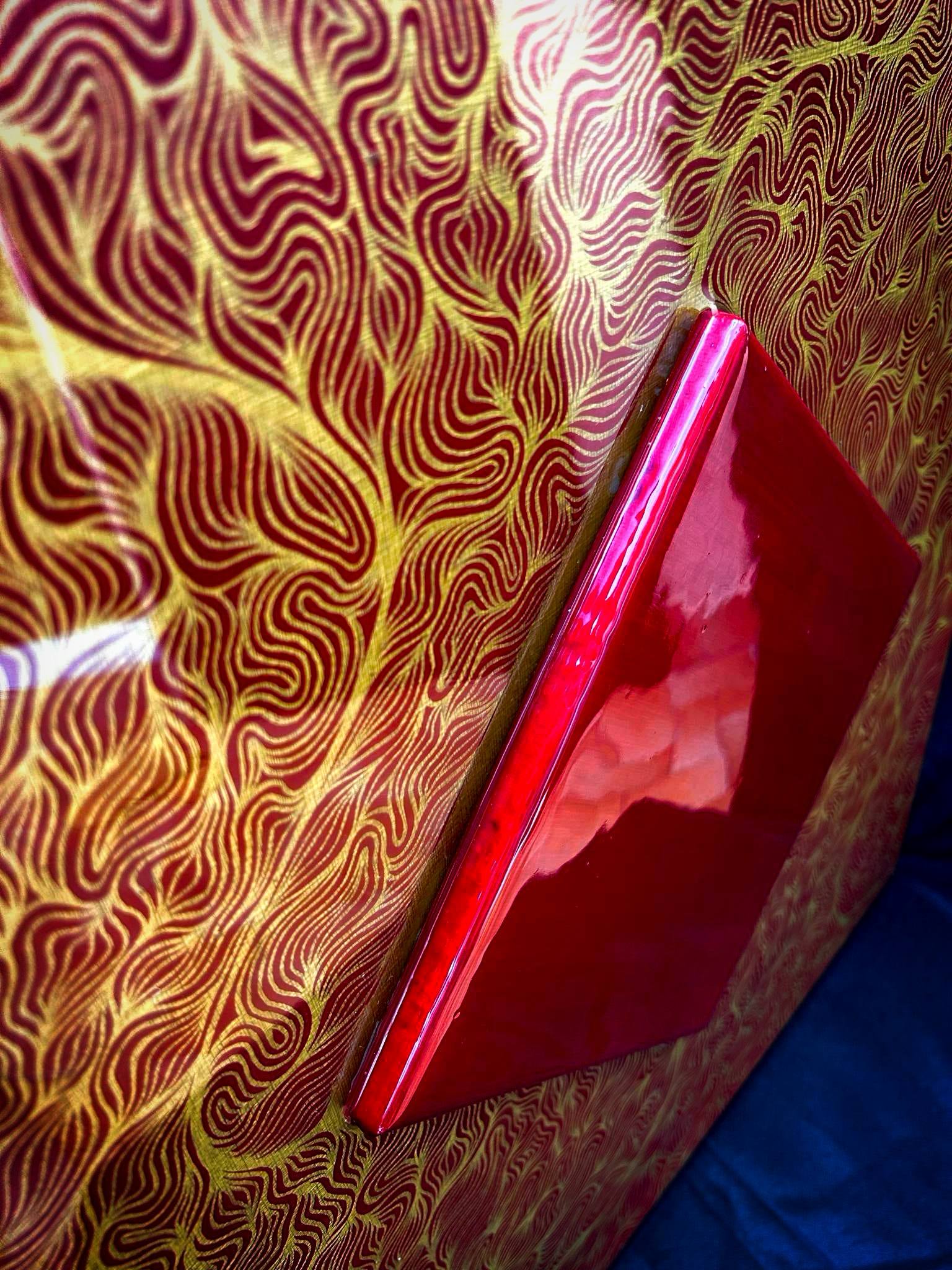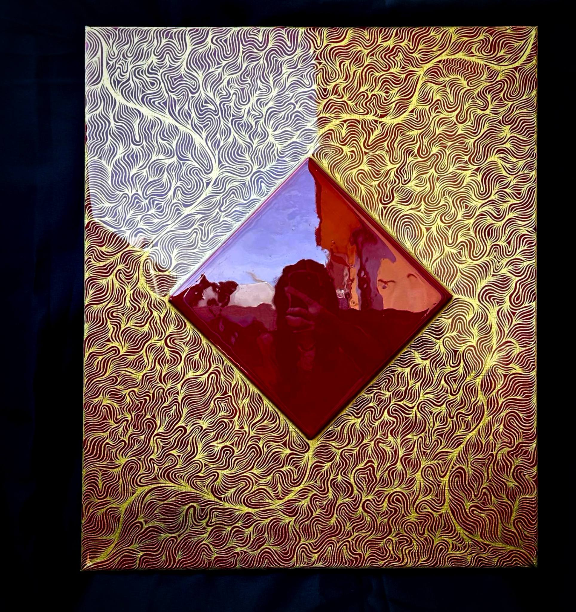 Ce travail fait main est l'assemblement de deux toiles en une. La petite toile rouge a été rajoutée, puis deux couches de résine on était appliquées pour rassembler le tout, pour un rendu beaucoup plus qualitatif.