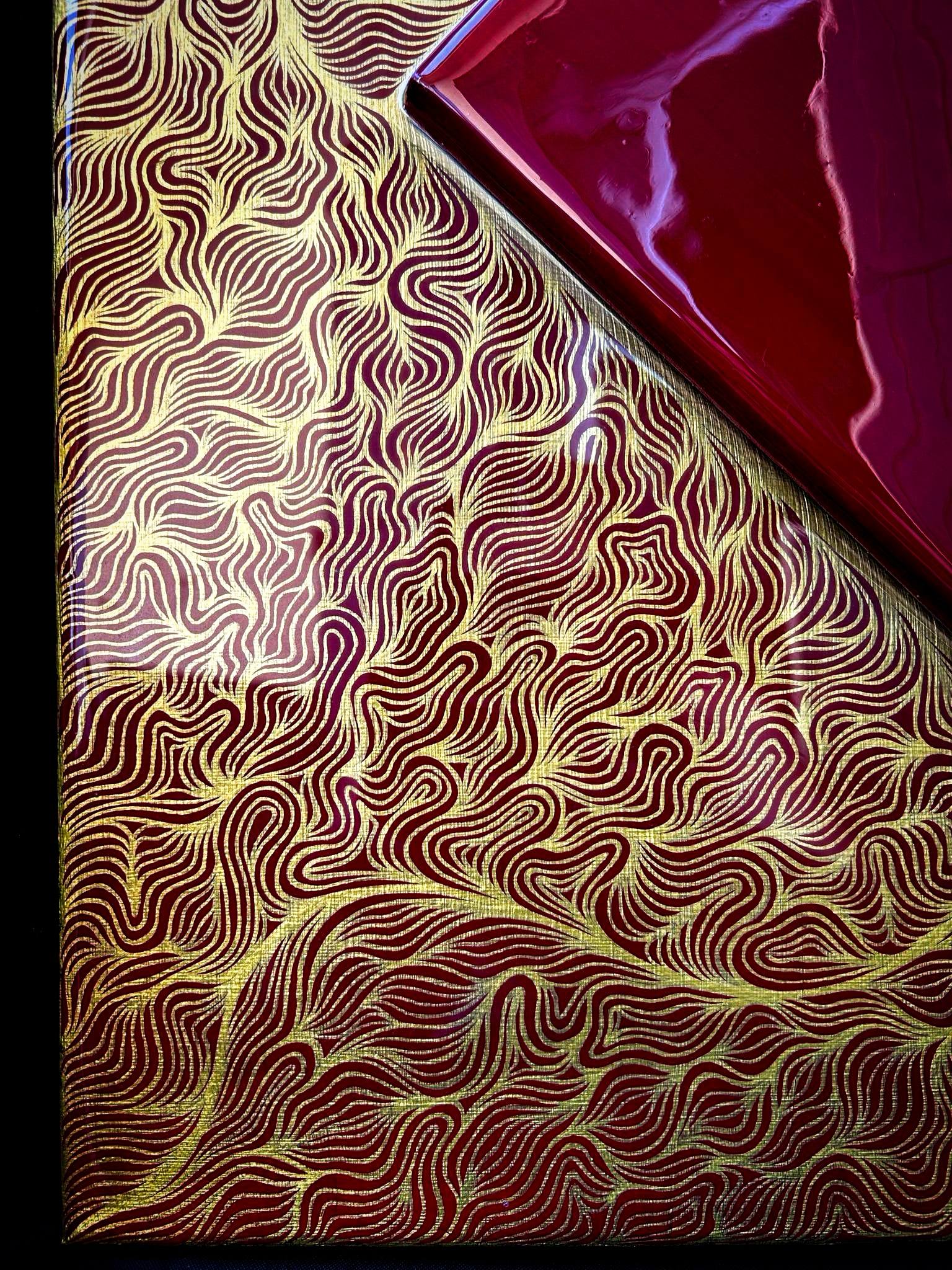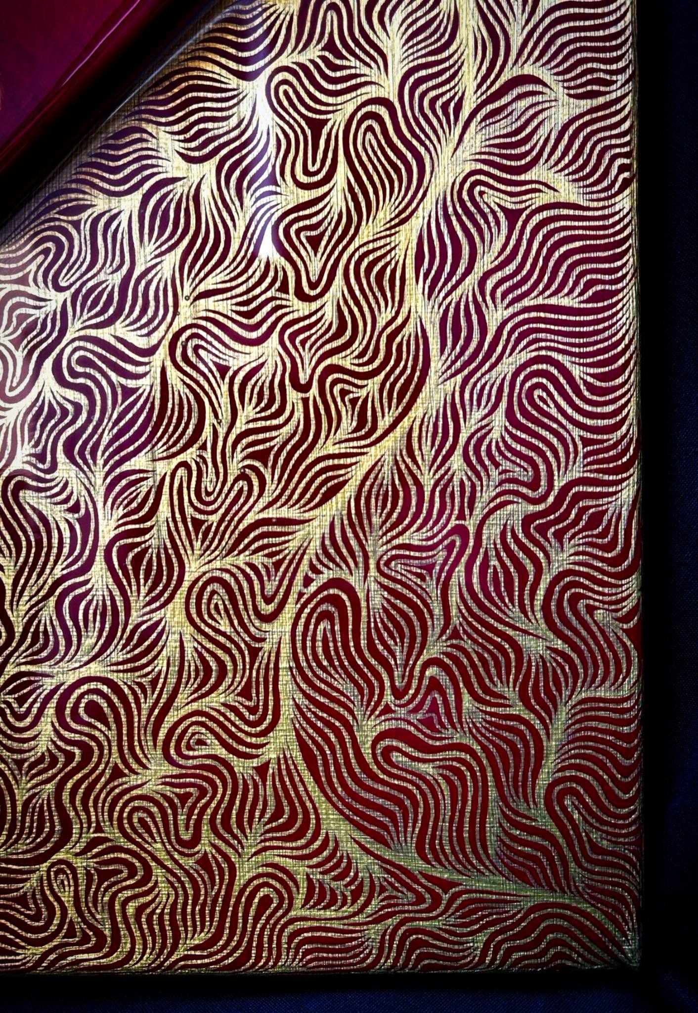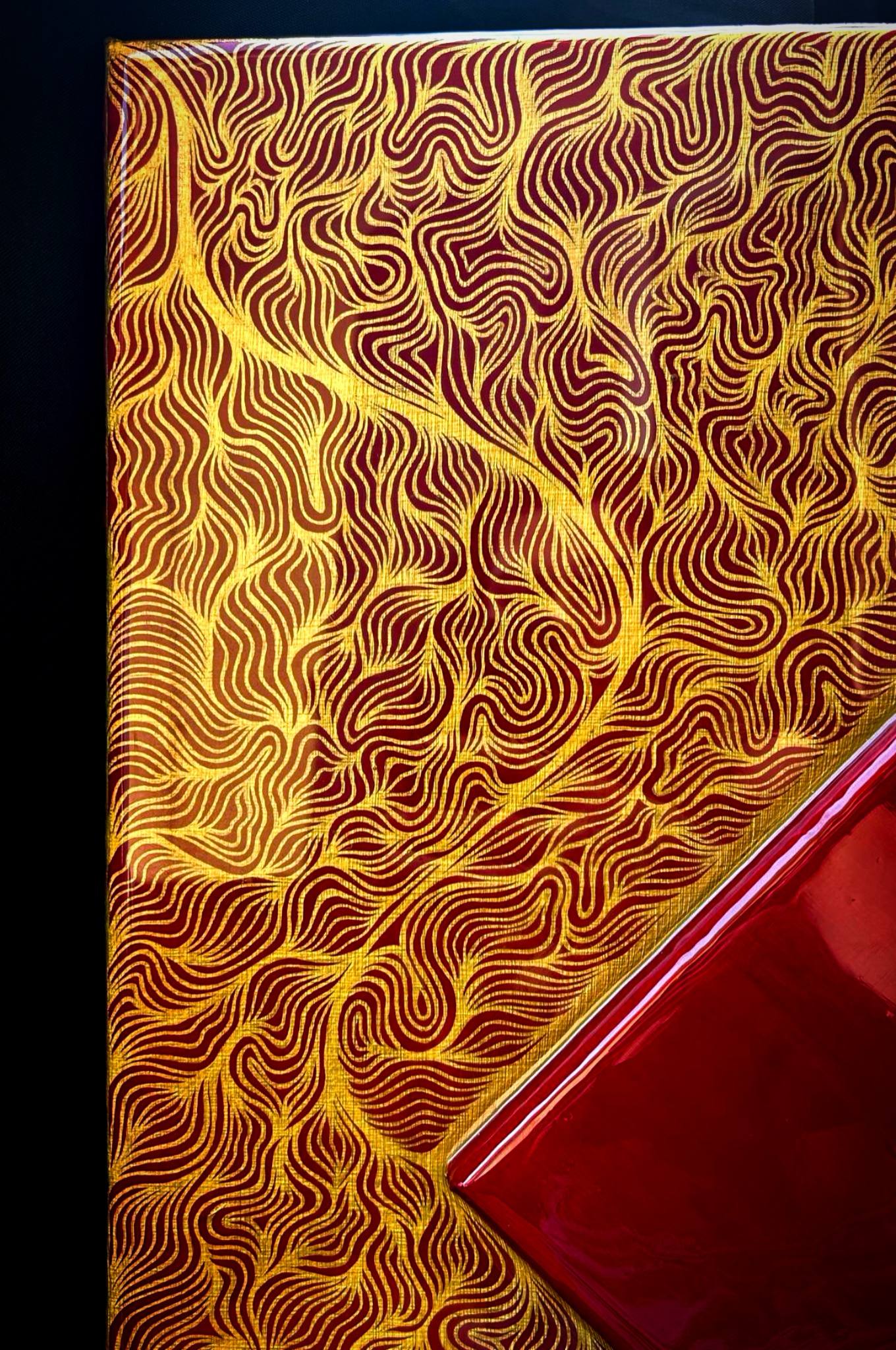 Ce travail fait main est l'assemblement de deux toiles en une. La petite toile rouge a été rajoutée, puis deux couches de résine on était appliquées pour rassembler le tout, pour un rendu beaucoup plus qualitatif.